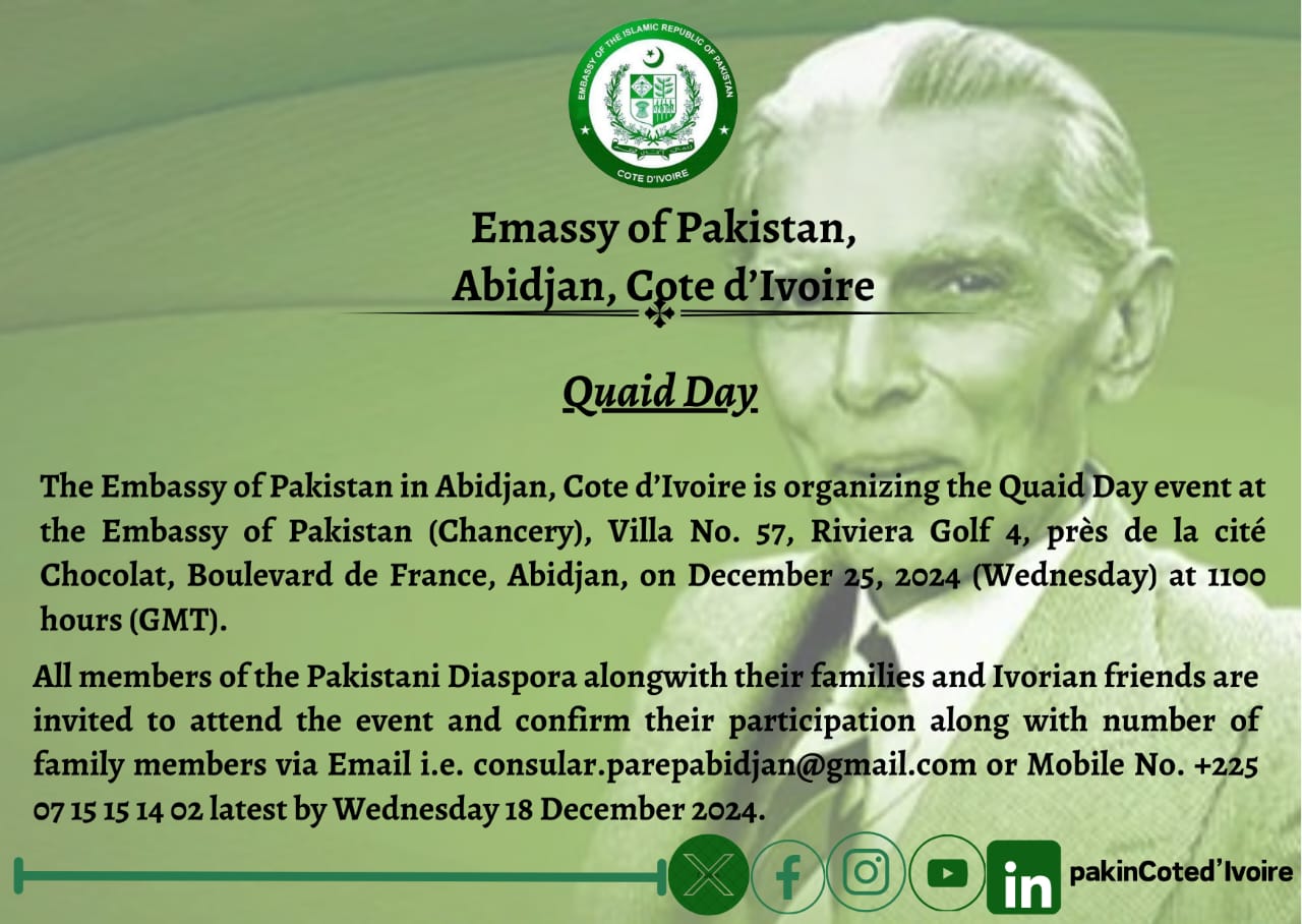 Invitation for the Pakistani Diaspora living in the Republic of Cote d’Ivoire for Quaid Day Event on 25 December 2024
