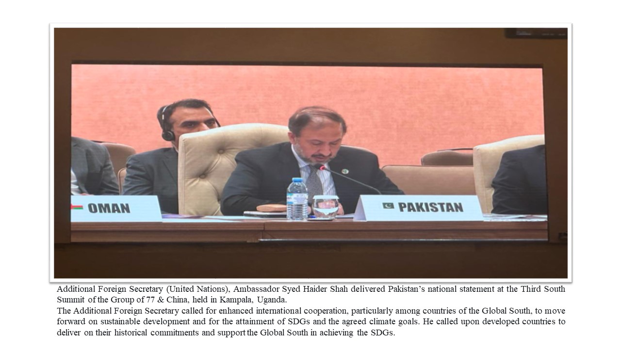Additional Foreign Secretary (United Nations), Ambassador Syed Haider Shah delivered Pakistan’s national statement at the Third South Summit of the Group of 77 & China, held in Kampala, Uganda. The Additional Foreign Secretary called for enhanced international cooperation, particularly among countries of the Global South, to move forward on sustainable development and for the attainment of SDGs and the agreed climate goals. He called upon developed countries to deliver on their historical commitments and support the Global South in achieving the SDGs.