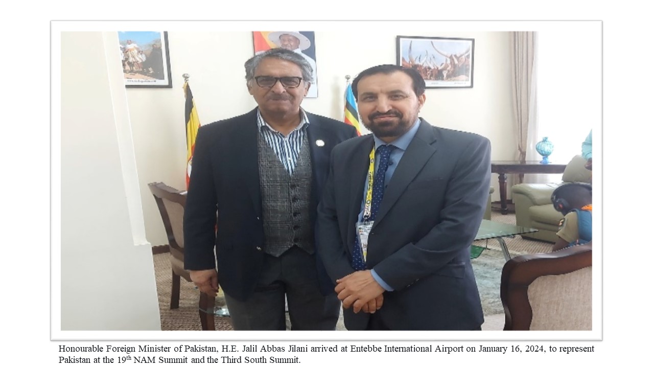 Honourable Foreign Minister of Pakistan, H.E. Jalil Abbas Jilani arrived at Entebbe International Airport on January 16, 2024, to represent Pakistan at the 19th NAM Summit and the Third South Summit .