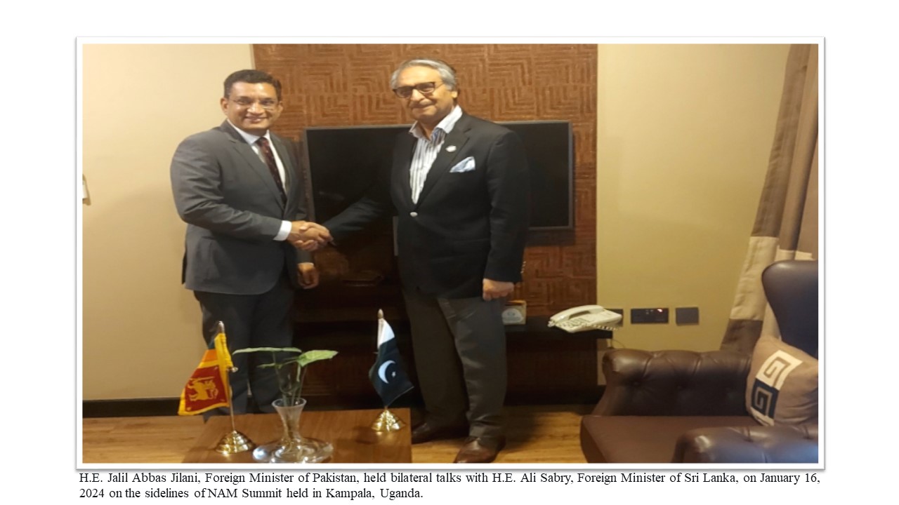 H.E. Jalil Abbas Jilani, Foreign Minister of Pakistan, held bilateral talks with H.E. Ali Sabry, Foreign Minister of Sri Lanka, on January 16, 2024 on the sidelines of NAM Summit held in Kampala, Uganda.