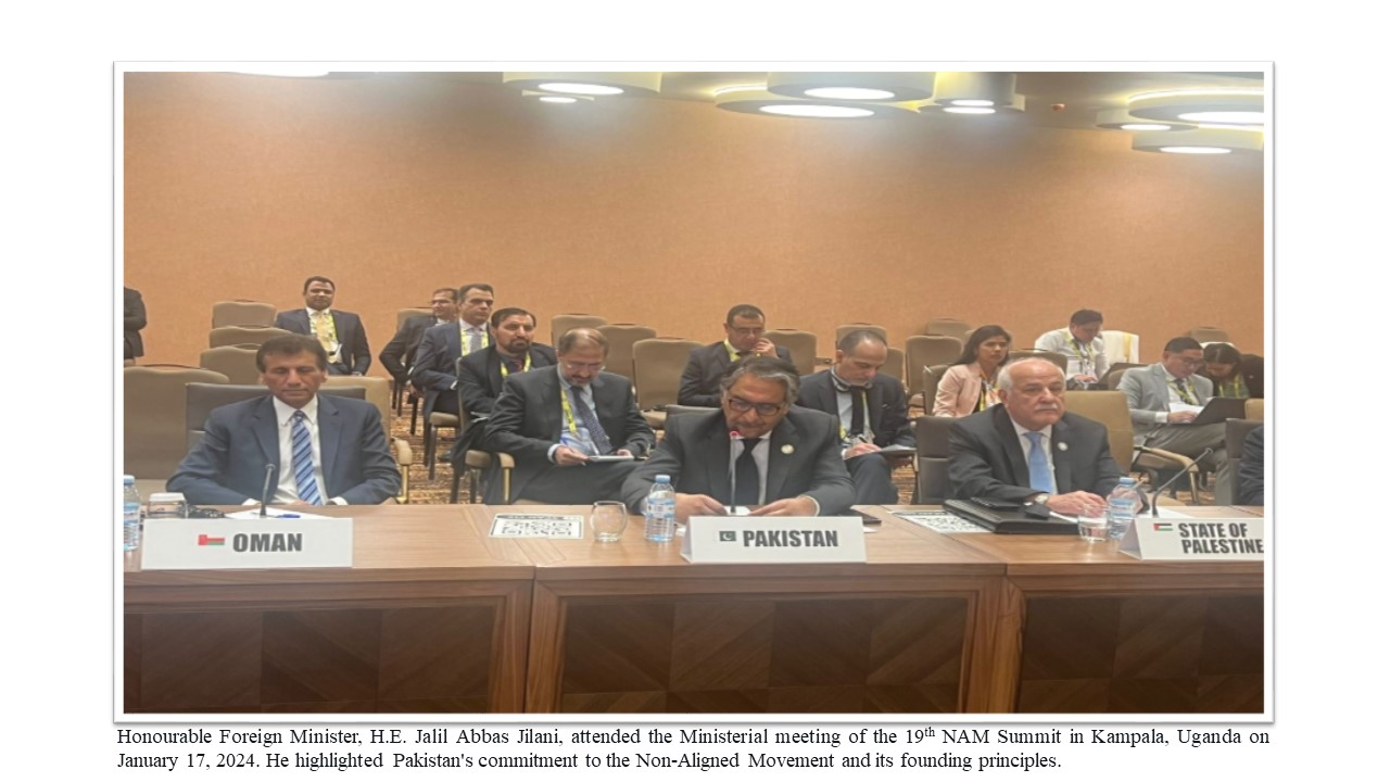 Honourable Foreign Minister, H.E. Jalil Abbas Jilani, attended the Ministerial meeting of the 19th NAM Summit in Kampala, Uganda on January 17, 2024. He highlighted Pakistan's commitment to the Non-Aligned Movement and its founding principles.