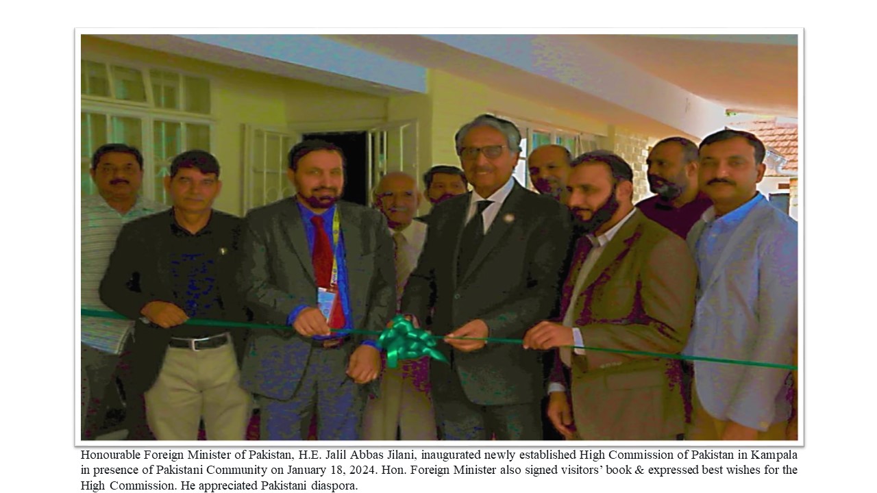 Honourable Foreign Minister of Pakistan, H.E. Jalil Abbas Jilani, inaugurated newly established High Commission of Pakistan in Kampala in presence of Pakistani Community on January 18, 2024. Hon. Foreign Minister also signed visitors’ book & expressed best wishes for the High Commission. He appreciated Pakistani diaspora.