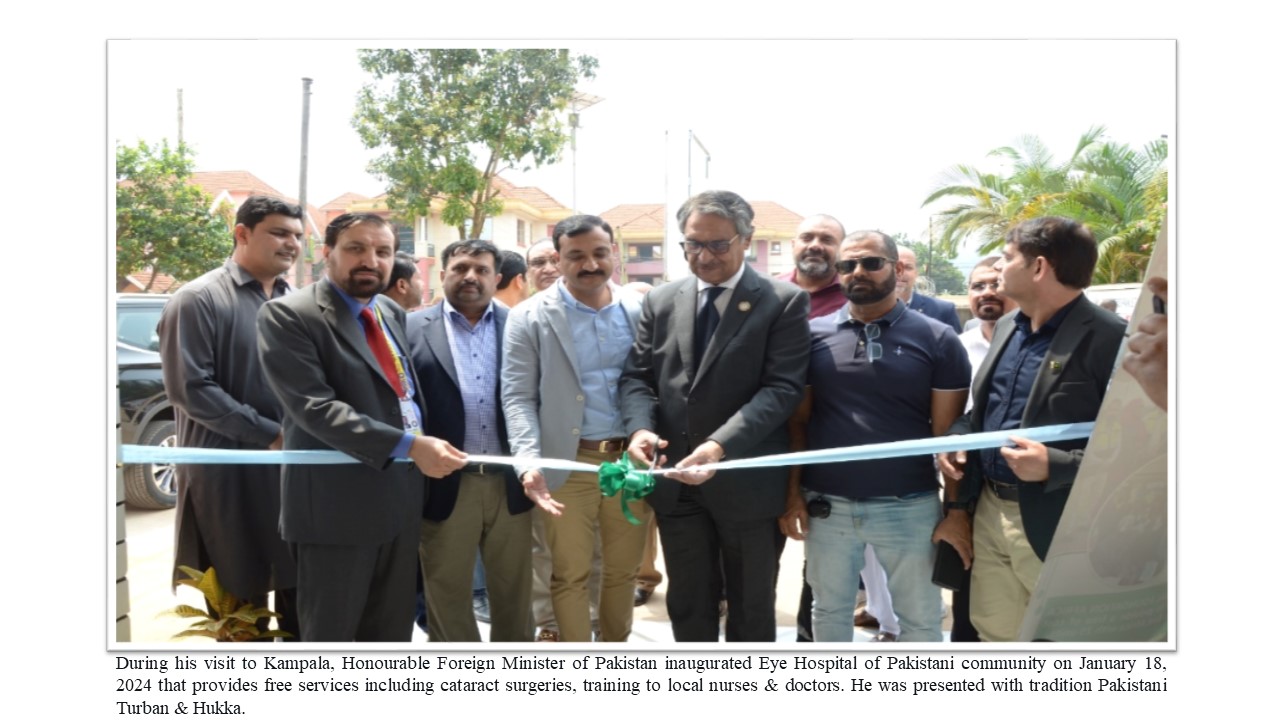 During his visit to Kampala, Honourable Foreign Minister of Pakistan inaugurated Eye Hospital of Pakistani community on January 18, 2024 that provides free services including cataract surgeries, training to local nurses & doctors. He was presented with tradition Pakistani Turban & Hukka.