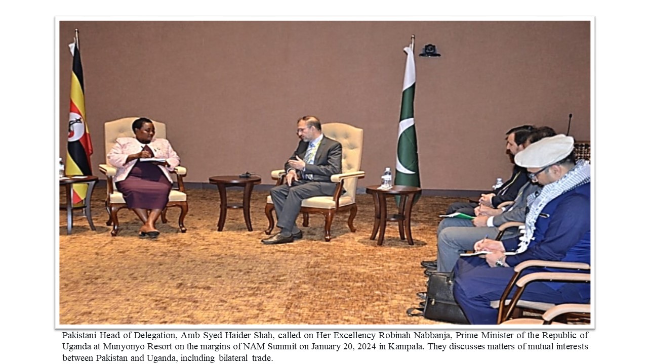Pakistani Head of Delegation, Amb Syed Haider Shah, called on Her Excellency Robinah Nabbanja, Prime Minister of the Repulbic of Uganda at Munyonyo Resort on the margins of NAM Summit on January 20, 2024 in Kampala. They discussed matters of mutual interests between Pakistan and Uganda, including bilateral trade.