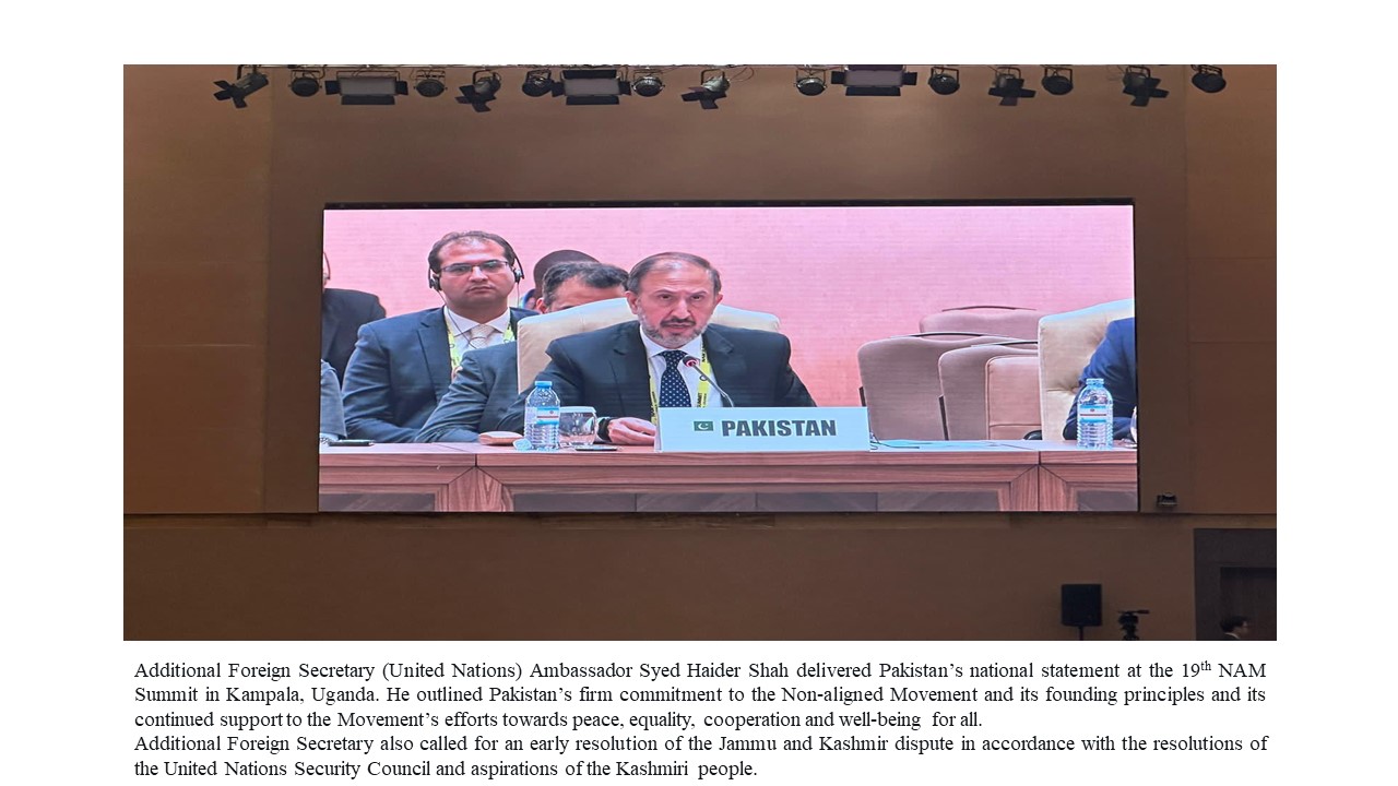 Additional Foreign Secretary (United Nations) Ambassador Syed Haider Shah delivered Pakistan’s national statement at the 19th NAM Summit in Kampala, Uganda. He outlined Pakistan’s firm commitment to the Non-aligned Movement and its founding principles and its continued support to the Movement’s efforts towards peace, equality, cooperation and well-being for all. Additional Foreign Secretary also called for an early resolution of the Jammu and Kashmir dispute in accordance with the resolutions of the United Nations Security Council and aspirations of the Kashmiri people.