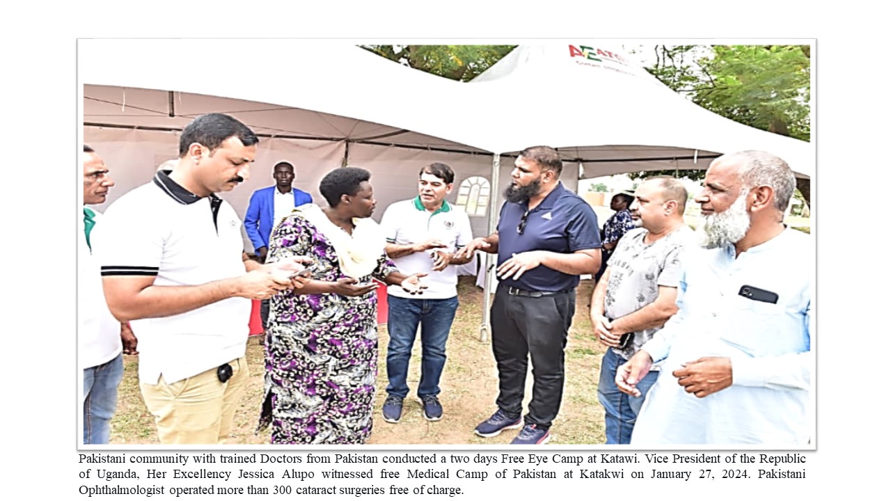 Pakistani community with trained Doctors from Pakistan conducted a two days Free Eye Camp at Katawi. Vice President of the Republic of Uganda, Her Excellency Jessica Alupo witnessed free Medical Camp of Pakistan at Katakwi on January 27, 2024. Pakistani Ophthalmologist operated more than 300 cataract surgeries free of charge.