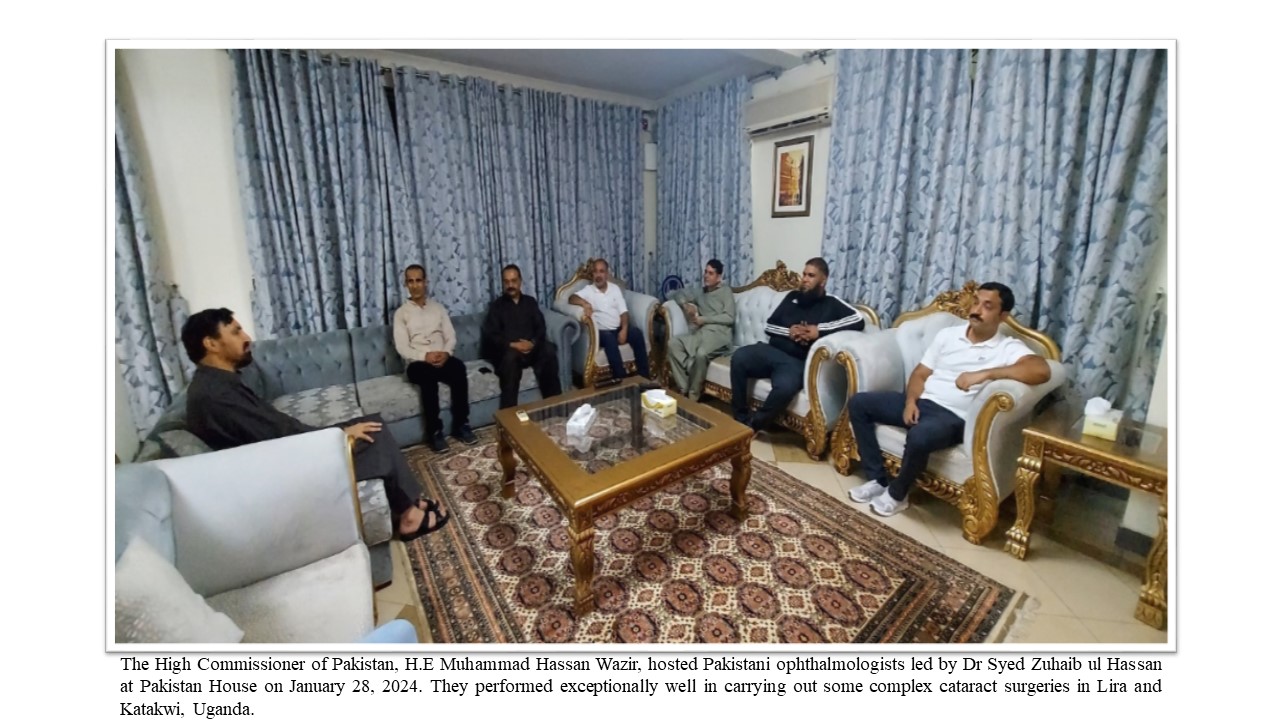 The High Commissioner of Pakistan, H.E Muhammad Hassan Wazir, hosted Pakistani ophthalmologists led by Dr Syed Zuhaib ul Hassan at Pakistan House on January 28, 2024. They performed exceptionally well in carrying out some complex cataract surgeries in Lira and Katakwi, Uganda.