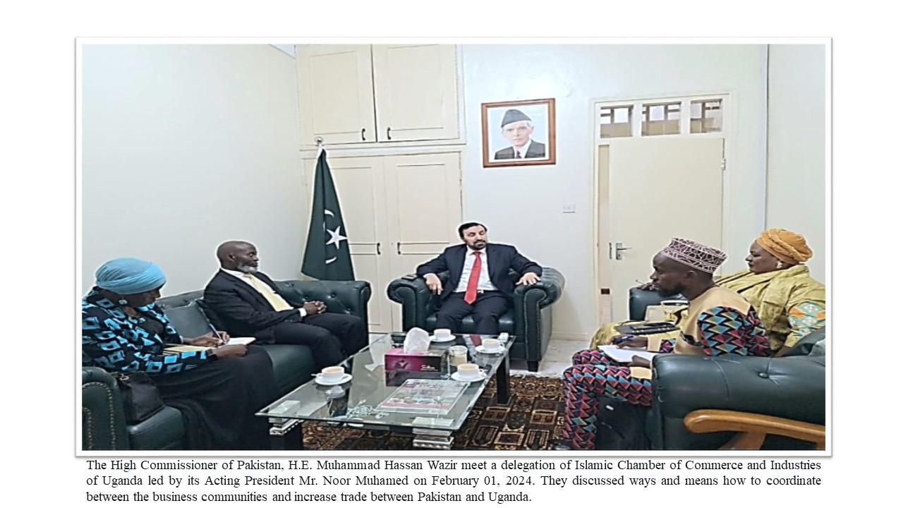 The High Commissioner of Pakistan, H.E. Muhammad Hassan Wazir meet a delegation of Islamic Chamber of Commerce and Industries of Uganda led by its Acting President Mr. Noor Muhamed on February 01, 2024. They discussed ways and means how to coordinate between the business communities and increase trade between Pakistan and Uganda.