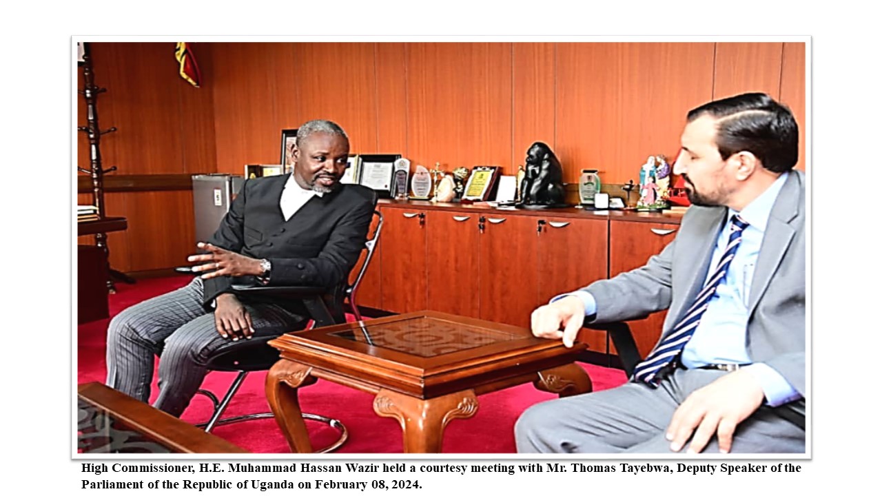 High Commissioner, H.E. Muhammad Hassan Wazir held a courtesy meeting with Mr. Thomas Tayebwa, Deputy Speaker of the Parliament of the Republic of Uganda on February 08, 2024.