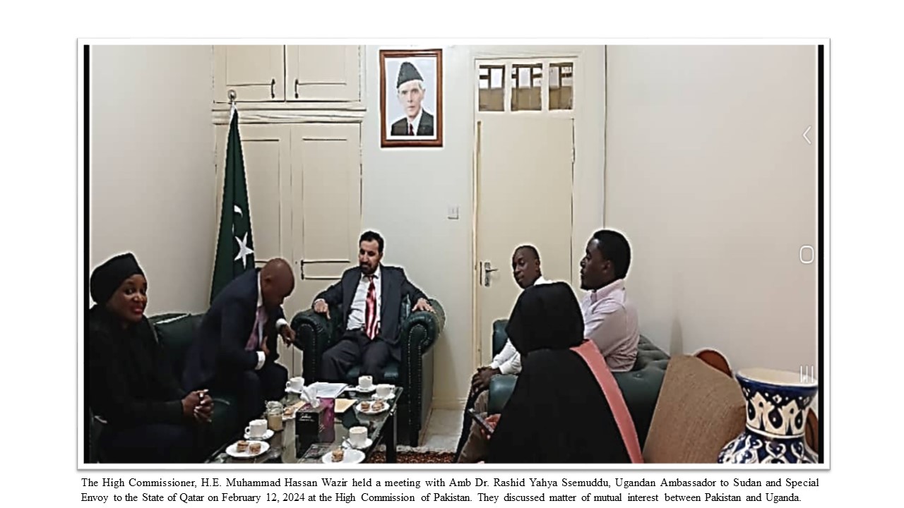 The High Commissioner, H.E. Muhammad Hassan Wazir held a meeting with Amb Dr. Rashid Yahya Ssemuddu, Ugandan Ambassador to Sudan and Special Envoy to the State of Qatar on February 12, 2024 at the High Commission of Pakistan. They discussed matter of mutual interest between Pakistan and Uganda.