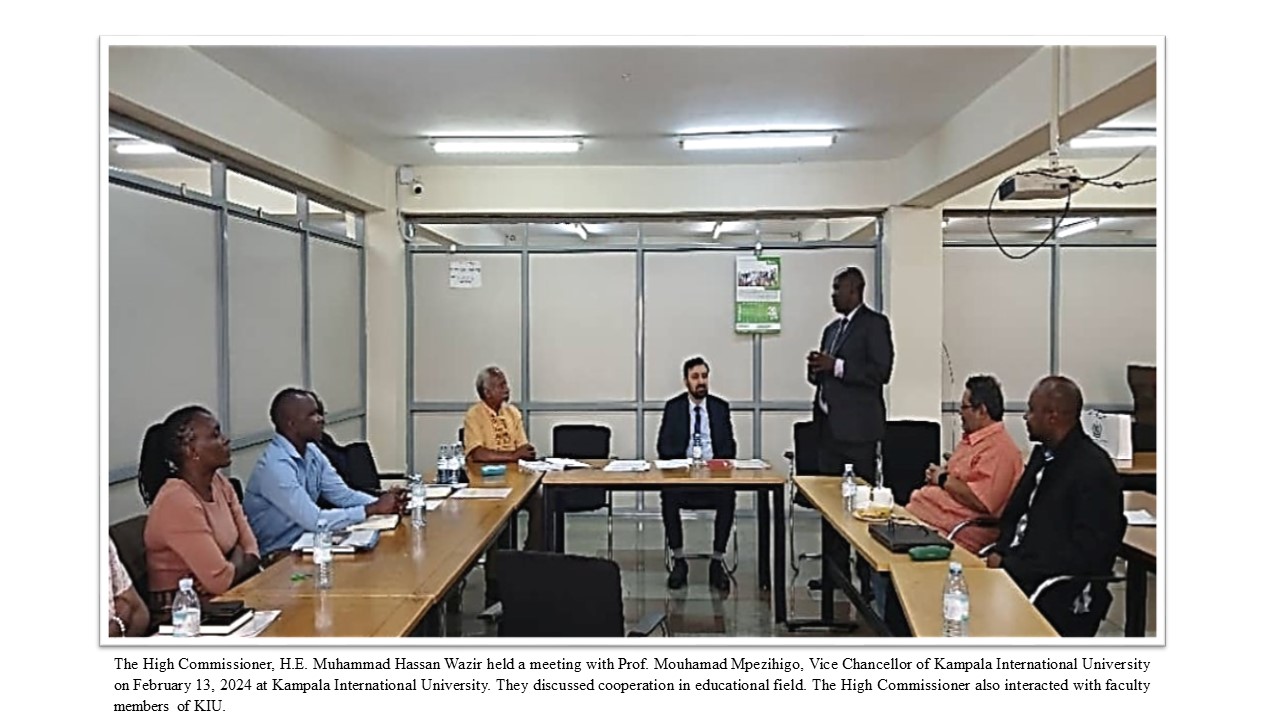 The High Commissioner, H.E. Muhammad Hassan Wazir held a meeting with Prof. Mouhamad Mpezihigo, Vice Chancellor of Kampala International University on February 13, 2024 at Kampala International University. They discussed cooperation in educational field. The High Commissioner also interacted with faculty members of KIU.