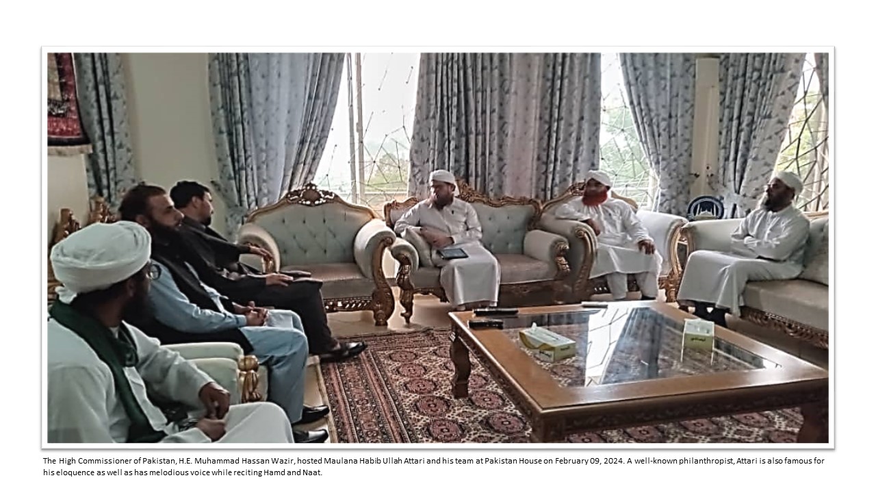 The High Commissioner of Pakistan, H.E. Muhammad Hassan Wazir, hosted Maulana Habib Ullah Attari and his team at Pakistan House on February 19, 2024. A well-known philanthropist, Attari is also famous for his eloquence as well as has melodious voice while reciting Hamd and Naat.