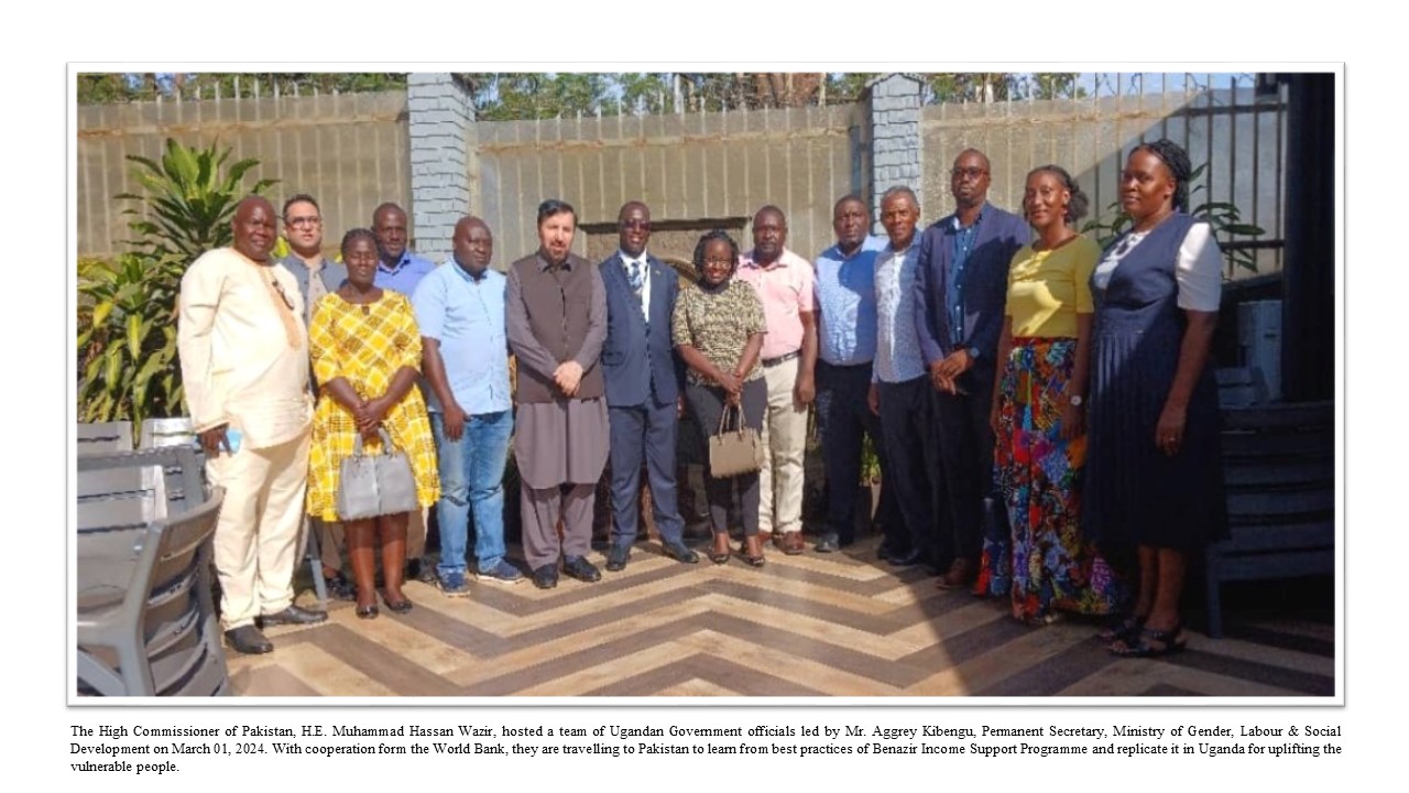The High Commissioner of Pakistan, H.E. Muhammad Hassan Wazir, hosted a team of Ugandan Government officials led by Mr. Aggrey Kibengu, Permanent Secretary, Ministry of Gender, Labour & Social Development on March 01, 2024. With cooperation form the World Bank, they are travelling to Pakistan to learn from best practices of Benazir Income Support Programme and replicate it in Uganda for uplifting the vulnerable people.