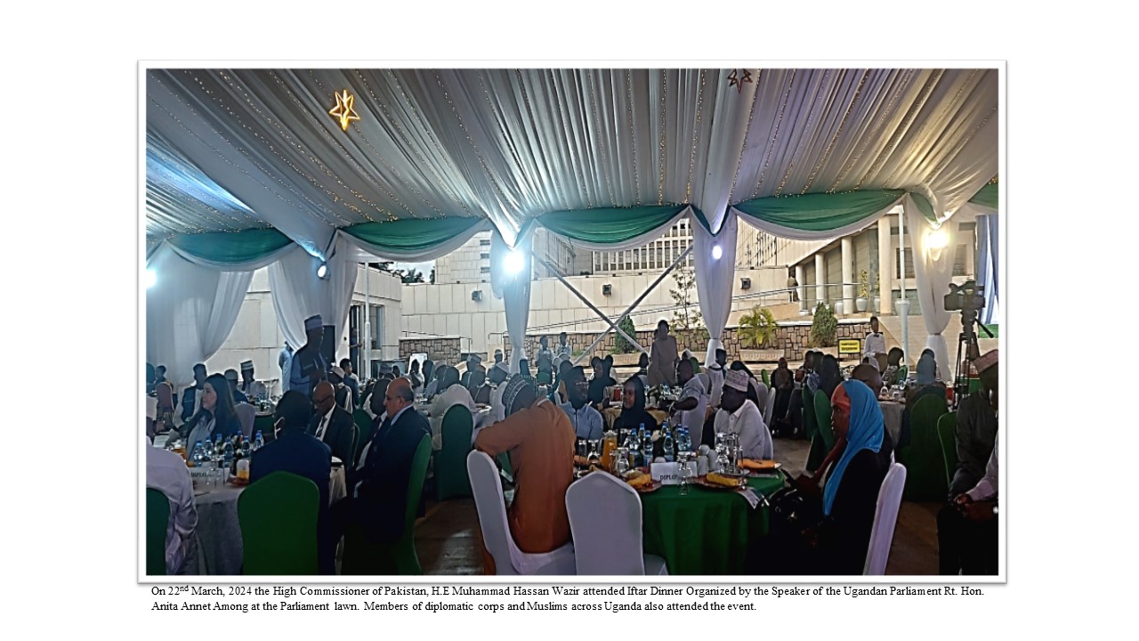On 22nd March, 2024 the High Commissioner of Pakistan, H.E Muhammad Hassan Wazir attended Iftar Dinner Organized by the Speaker of the Ugandan Parliament Rt. Hon. Anita Annet Among at the Parliament lawn. Members of diplomatic corps and Muslims across Uganda also attended the event.