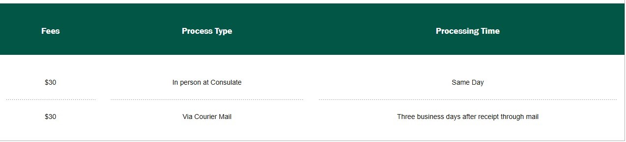 Fee in the shape of money order or cashier’s check payable to the Consulate General of Pakistan. Personal checks are not acceptable and fees are non refundable.