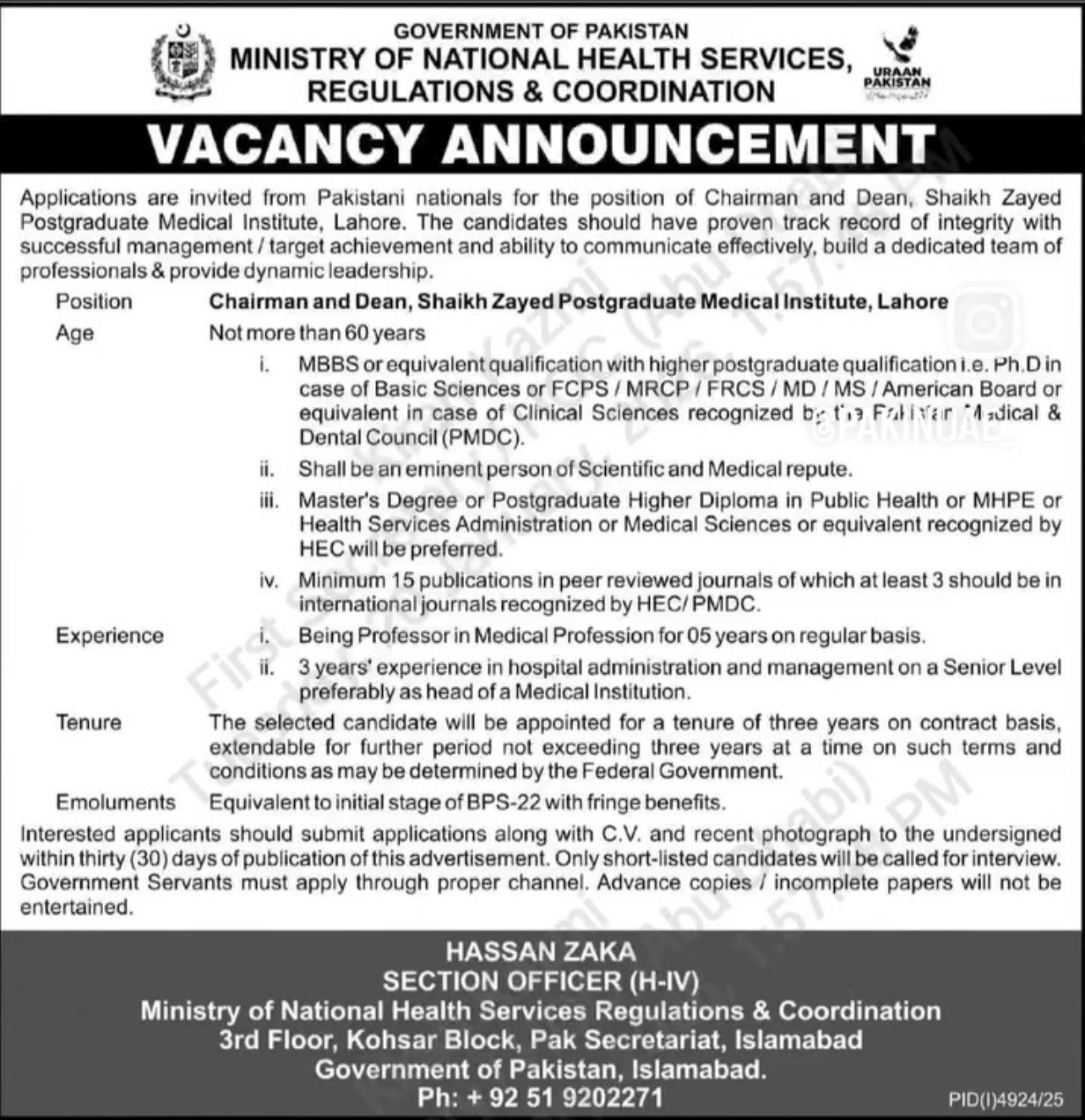 Advertisement of the post of Chairman and Dean, Sheikh Zayed Postgraduate Medical Institute, Lahore