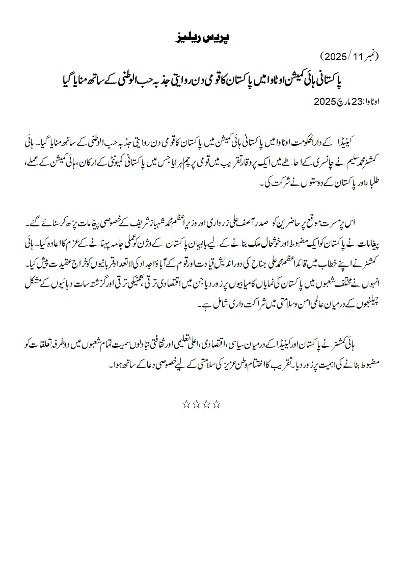 پاکستانی ہائی کمیشن اوٹاوا میں پاکستان کا قومی دن روایتی جذبہ حب الوطنی کے ساتھ منایا گیا