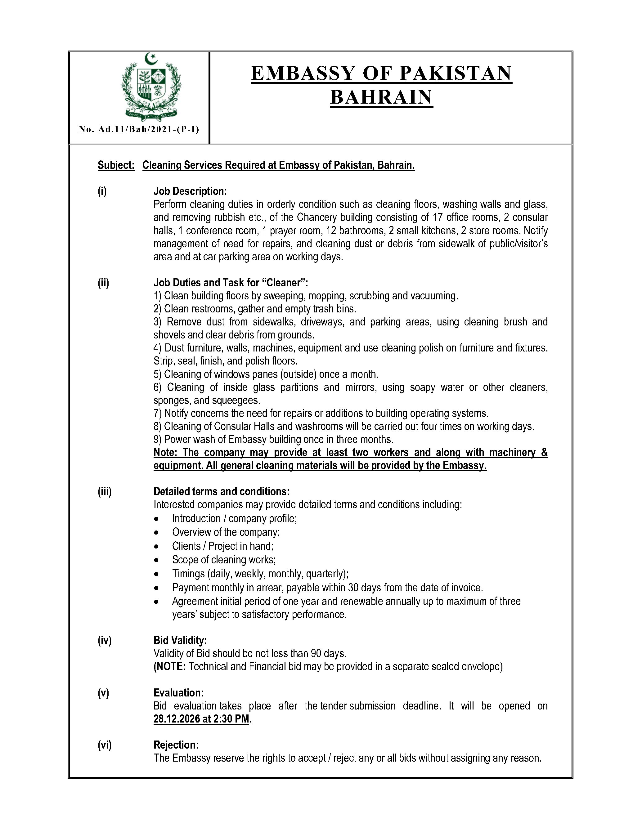 Cleaning Services Required at Embassy of Pakistan, Bahrain
