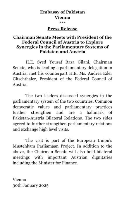 Meeting between Chairman Senate, H.E. Syed Yousaf Raza Gilani & President Federal Council of Austria
