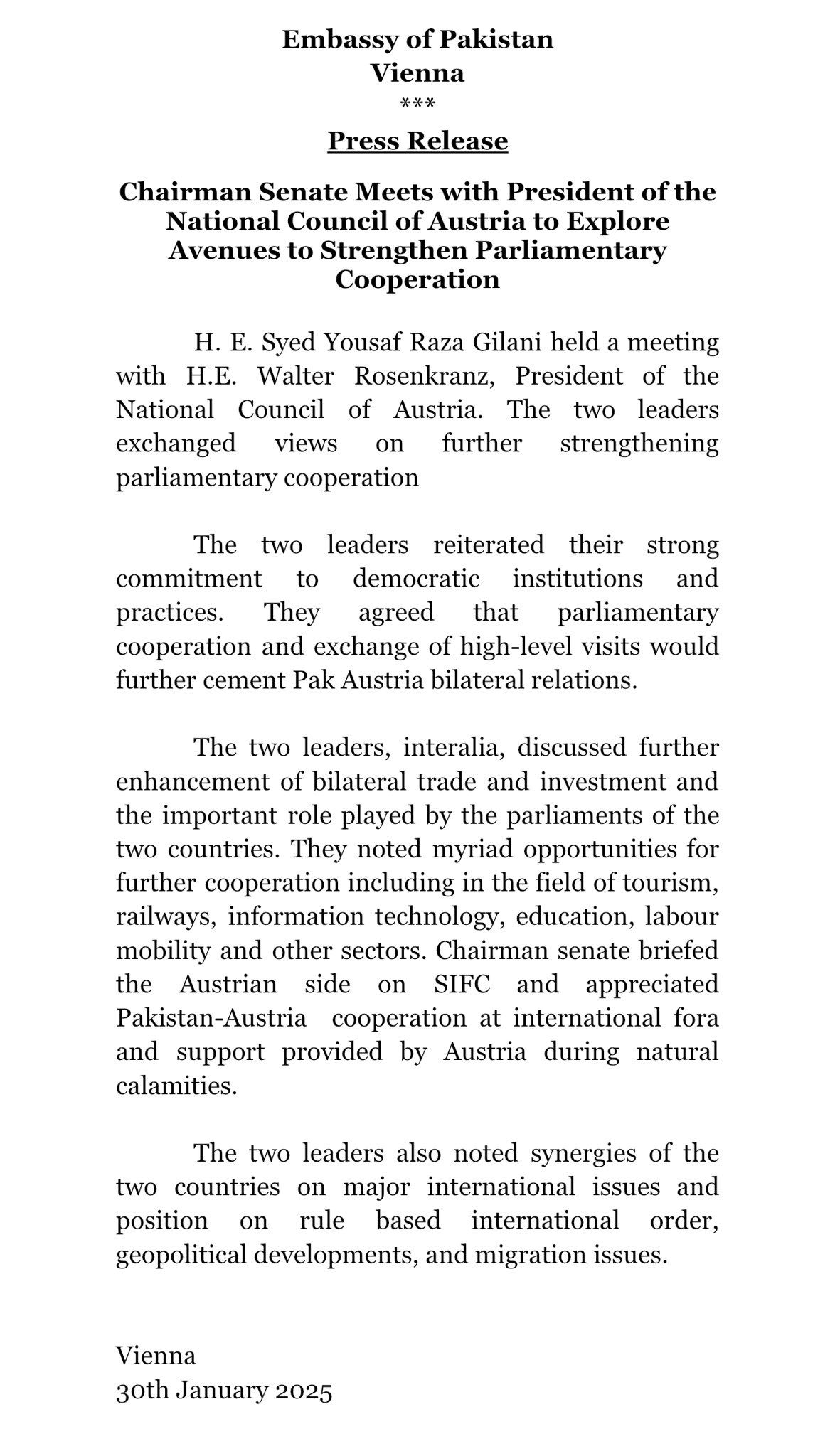 Meeting between Chairman Senate, H.E. Syed Yousaf Raza Gilani & President National Council of Austria
