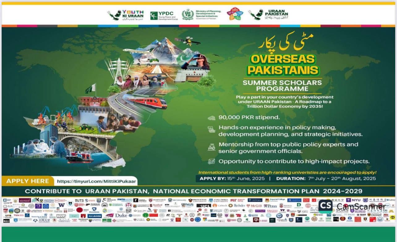 The Ministry of Planning, Development and Special Initiatives, Govt. of Pakistan has offered a Summer Scholars Program for overseas Pakistan. The program is an intensive six week Summer Scholars Program focused on key reforms initiatives under the Uraan Pakistan – National Economic Transformation Plan 2024-2029 and the 5Es Framework. Through their work at the Ministry of Planning Development and Special Initiatives, participants will gain valuable exposure to policy development, governance, and public sector management.