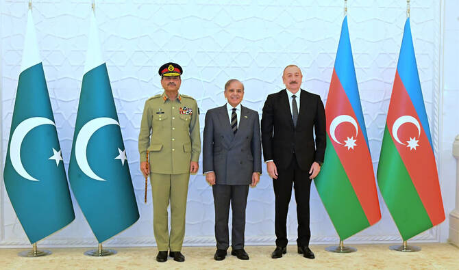 The Prime Minister Muhammad Shehbaz Sharif attended the Military Parade to celebrate the 5th anniversary of Azerbaijan’s victory in the 44-day Patriotic War, along with the Presidents of Azerbaijan and Türkiye. The Prime Minister also held a meeting with the President of Azerbaijan H.E. Ilham Aliyev at Presidential Palace of Azerbaijan. Chief of the Army Staff, Field Marshal Syed Asim Munir was also present in the meeting.