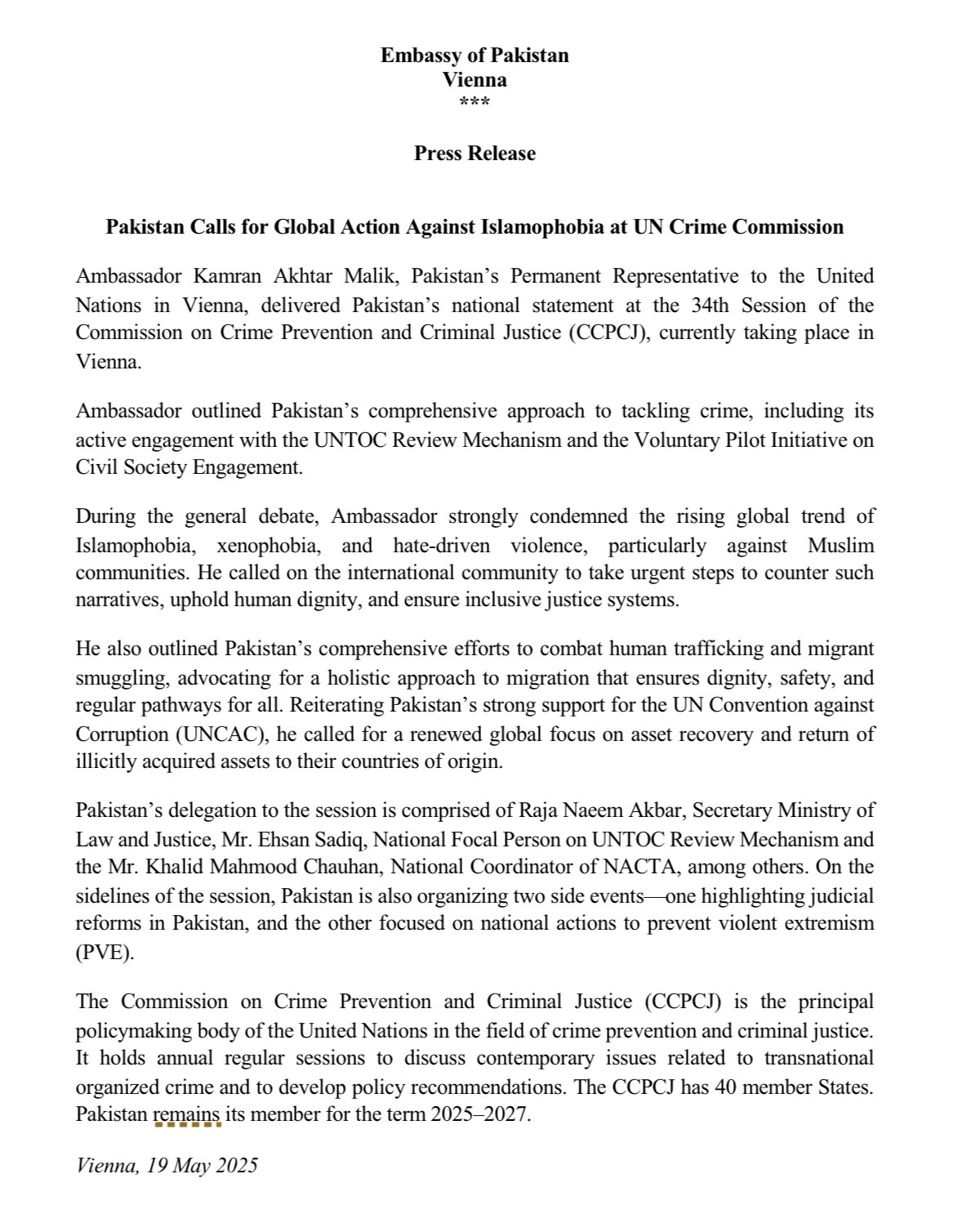 Pakistan Calls for Global Action against Islamophobia during the 34th Session of United Nations Commission on Crime Prevention and Criminal Justice (CCPCJ)